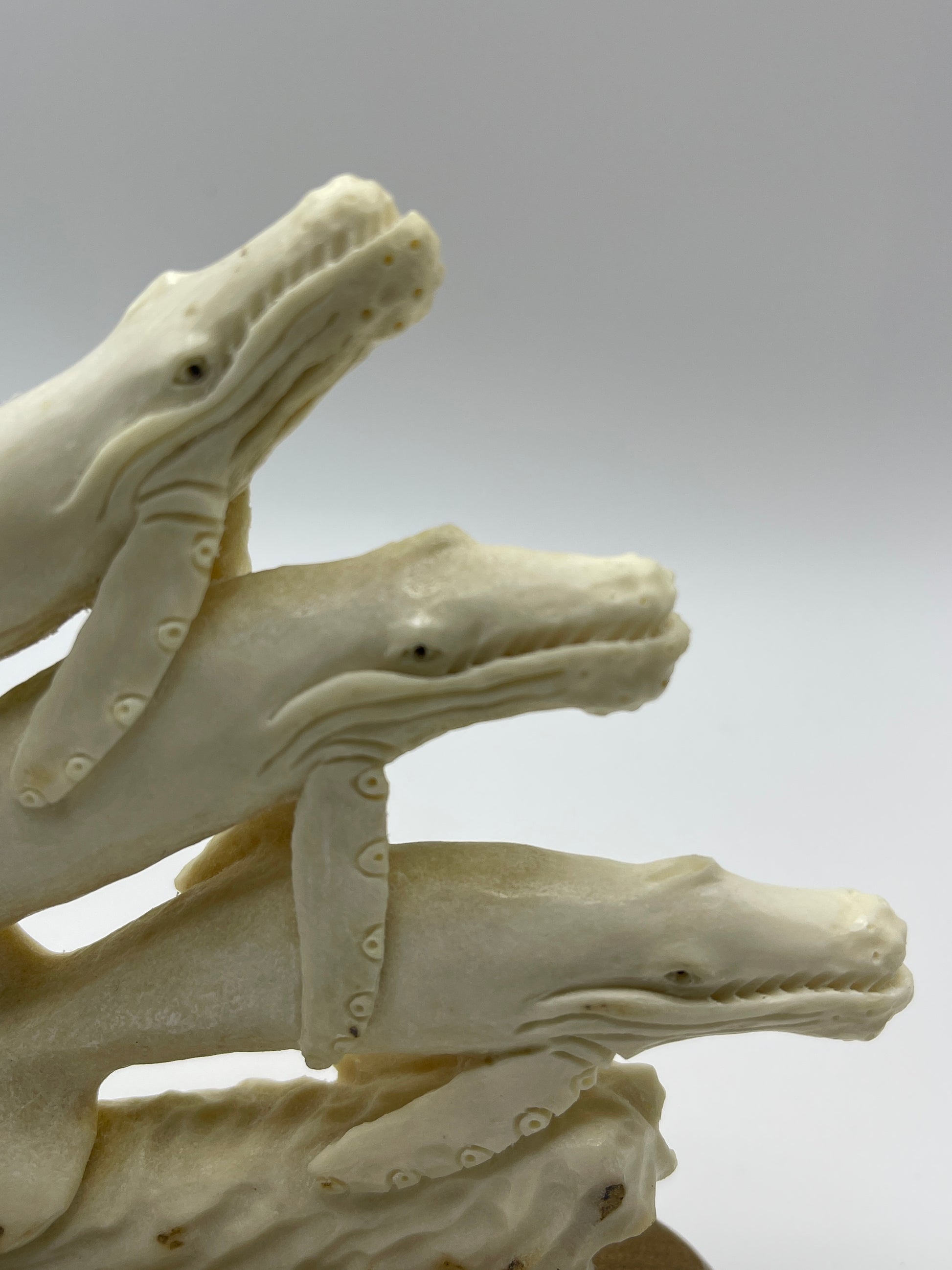 Whale trio hand carved from antler on wood base