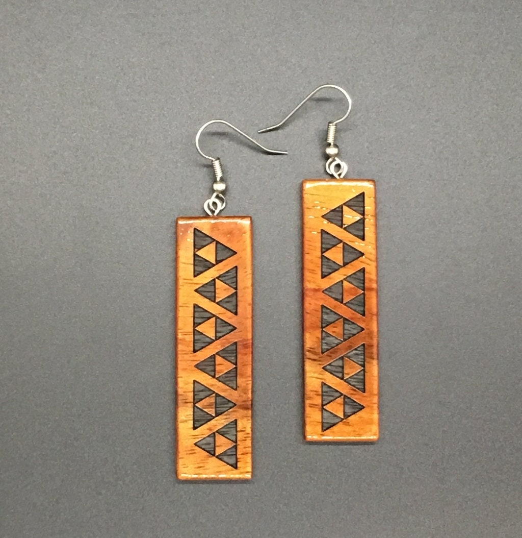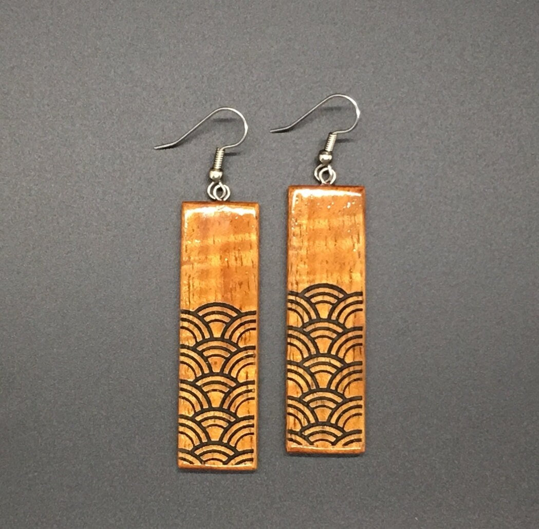 Koa Long Rectangle Engraved Earrings